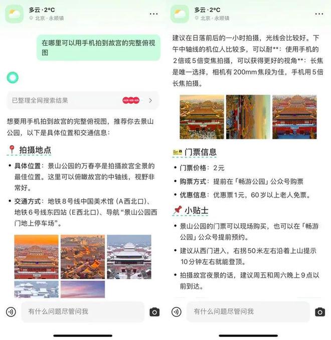 种草意味着筛选和比较,对AI的理解分析能力要求更高,而生活场景下,更重要的是真实的信息以及全面的考量。举个例子,我们先问了一个拍照打卡类的问题,“在哪里可以用手机拍摄到故宫的完整俯视图”。结果点点给到了一份非常完整的攻略,包括具体位置“景山公园的万春亭”,并提到拍摄时间、设备参数、人群情况,以及前往公园的交通方式、路线,很靠谱了。