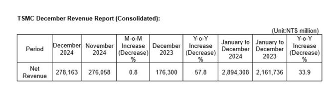 2024年1月至12月,台积电营业额为28943.1亿新台币,较2023年同期增长33.9%。