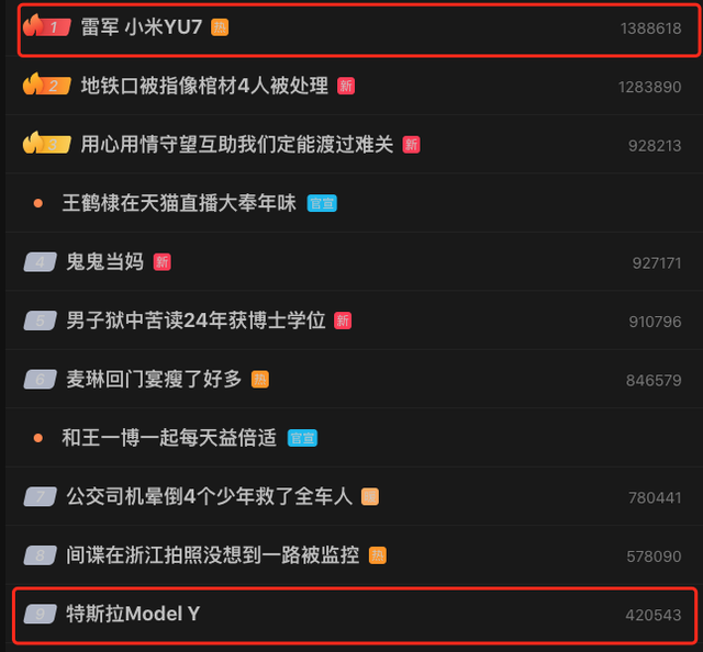 在上个月,小米汽车官方正式宣布,小米的新款SUV车型代号为YU7,或将对标特斯拉Model Y,将在今年上市。截至发稿,小米YU7位居微博热搜第一,Model Y则在热搜第九。