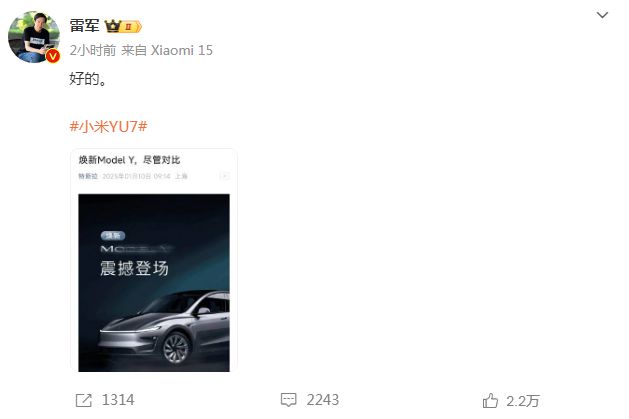 同时,特斯拉官微发布消息,宣传语为“焕新Model Y,尽管对比”。对此,小米创办人、董事长兼CEO雷军发布微博称“好的”。据报道,小米汽车第二款车型、首款SUV车型-YU7将于6月前后上市。