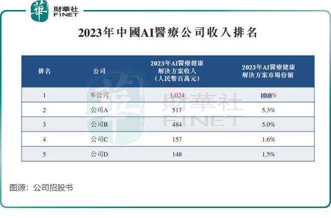 市场地位方面,微医是中国AI医疗健康解决方案的最大提供商,也是前三家专注于提供数字化及综合医疗服务的数字健康公司。按收入计,微医于2023年在中国AI医疗公司中排名第一,市场份额为10.6%,远高于排名第二的公司为5.3%的市场份额。