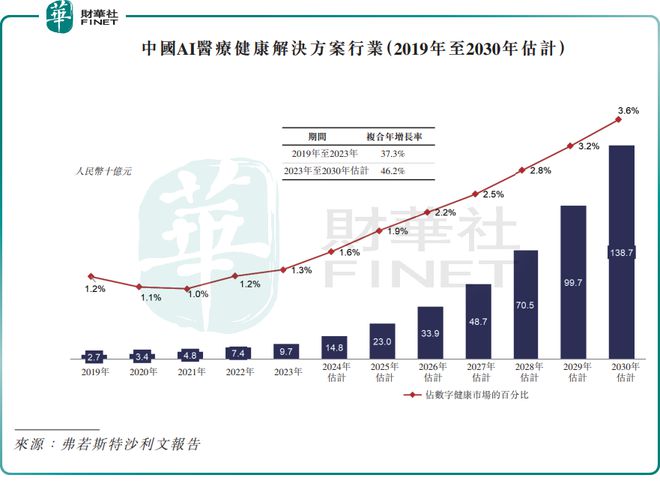 伴随着人工智能浪潮的到来,AI应用在提升医疗机构在医疗分诊、检测、诊断、处方、用药及健康管理等方面正日益发挥作用,AI医疗俨然正成为一条黄金赛道。根据弗若斯特沙利文报告,中国的AI医疗健康解决方案市场预计由2023年的人民币97亿元增至2030年的人民币1387亿元,复合年增长率高达46.2%。