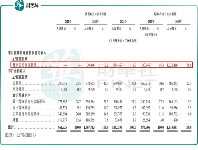 2021年以来,健康管理会员服务业务的收入增长抵消了数字医疗平台业务增长乏力的影响,带动公司总收入的增长。招股书显示,2021年至2023年及2024年上半年,公司总收入分别为9.62亿元、13.68亿元、18.63亿元及18.18亿元。