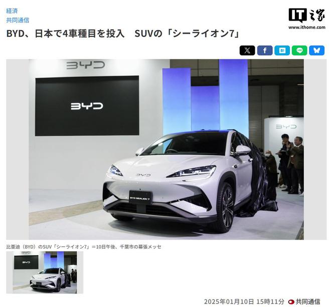 IT之家 1 月 10 日消息,据共同社报道,中国电动汽车巨头比亚迪日本公司今日在“东京汽车沙龙”展会上宣布,今年将在当地市场推出第四款车型 ——SUV“Sealion 7”(对应国内海狮 07 EV),该车将在千叶市的幕张展览中心首次亮相。