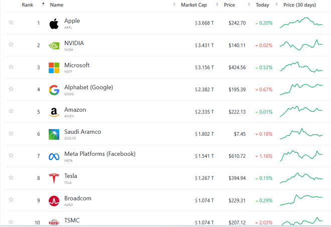 “高性能数据中心AI GPU系统+CUDA生态壁垒”为底层技术,打造出机器人AI大模型从构建蓝图到实际AI训练,再到终端应用部署的机器人软硬件一体化生态系统,以及通过在CES新推出的RTX系列超高性能显卡将AI业务全面向个人消费者端延伸,乃华尔街顶级投资机构Wedbush以及Rosenblatt Securities看好英伟达市值在未来1-2年冲击5万亿美元市值的核心逻辑。当前英伟达市值徘徊在3.43万亿美元市值附近,仅次于苹果,位列全球第二大市值公司。