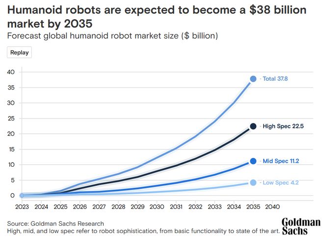 特斯拉掌舵者马斯克表示,如果一切进展顺利,2026年特斯拉的擎天柱AI人形机器人产量将增加10倍,也就是大约5万-10万台,马斯克预测2027年将进一步提高至10倍,也就是50万台起。高盛近期发布的研究报告指出,人形机器人有望在2024年~2027年间率先应用于全球制造业工厂,而进入消费端市场的时间则预计在2028年~2031年之间;高盛预测,到2035年全球人形机器人出货量将达140万台,市场规模约380亿美元,远超高盛此前给出的60亿美元预测,相比之下高盛预测当前人形机器人市场规模甚至不到20亿美元。