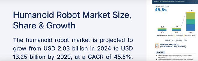 Markets And Markets近日公布的预测报告显示,2024年全球人形机器人市场规模预计仅仅约20亿美元,到2029年有望迅速扩张至132.5亿美元规模,复合年增长率有望超过45%。该研究机构表示,2024年开始,人形机器人将广泛渗透至医疗保健护理与手术辅助、汽车制造以及危险程度较高的制造业等多个行业,有望大幅提升各行业经营效率。