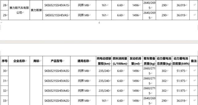 问界M8此次申报了6种不同版本车型,提供161/235/240km三种纯电续航,燃料消耗量(预计为馈电状态)6.60L/100km。