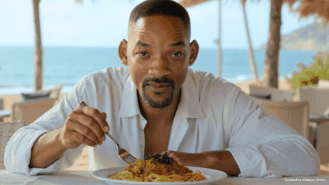 你或许还有印象, 2023年,在那个AI生成视频刚刚起步的时代,生产的内容大多还抽象得很,经典案例就是Reddit上有人用“威尔·史密斯吃意大利面”生成的这段视频——画面上仿佛伪人一样的“威尔·史密斯”在那里拿着意面手舞足蹈,做出各种莫名其妙的张嘴和咀嚼动作,仿佛什么诡异的祭祀场景。