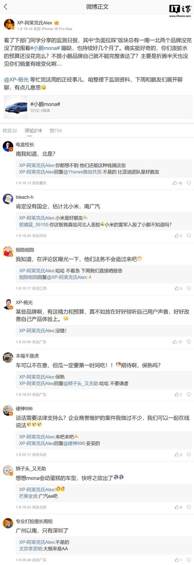 IT之家 1 月 13 日消息,小鹏汽车品牌公关负责人 @XP-阿莱克氏 Alex 于 1 月 8 日社交平台发文表示:“看了下部门同学分享的监测日报,其中“负面拉踩”版块总有一南一北两个品牌没完没了的围着‘小鹏 mona’蹦跶,也持续好几个月了。确实挺好奇的,你们泼脏水的预算还没花完么?不提小鹏品牌自己就不能完整表达了?主要是折腾半天也没见你们销量有啥变化啊…”