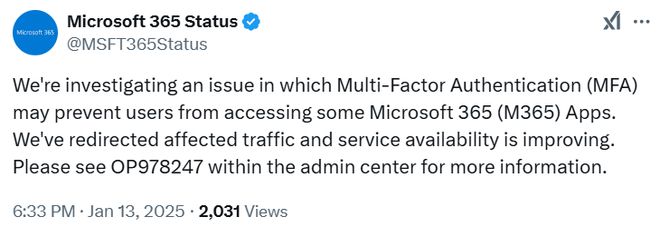 微软365当地时间1月13日在社媒平台X发文称,正调查多重身份验证(MFA)功能出现的问题,该问题可能导致用户无法访问部分微软365应用。