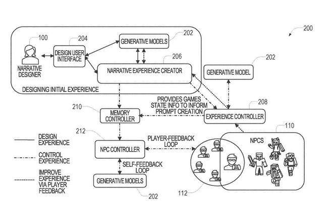 专利概述了 AI 迭代游戏的方式,例如根据指令快速生成与叙事相关的对象。以《我的世界》(Minecraft)为例,玩家可以输入指令,实时创建新的游戏规则、系统、非玩家角色(NPC)或叙事内容。