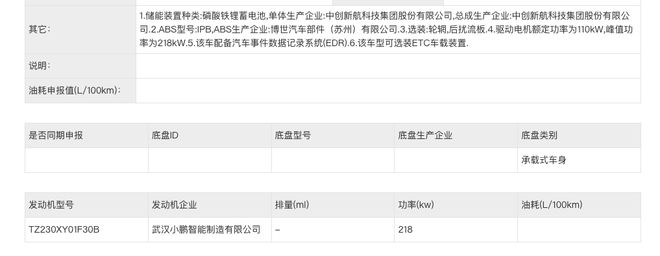 在三电部分,小鹏G7目前申报的版本配备了来自中创新航的磷酸铁锂电池包。电机部分,小鹏G7搭载了峰值功率218kW的单电机,供应商为小鹏旗下的“武汉小鹏智能制造有限公司”。