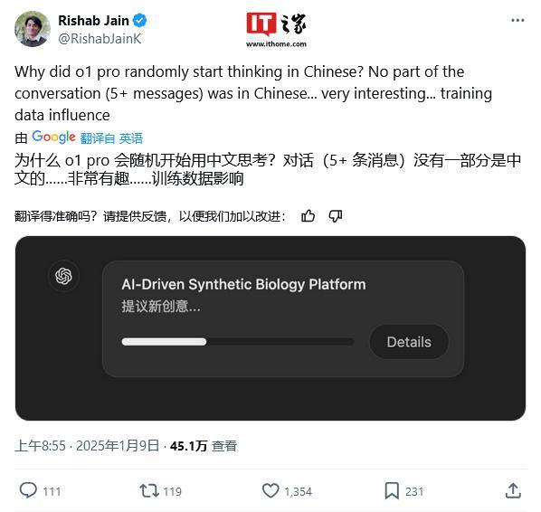 网友 @RishabJainK 于 1 月 9 日在 X 平台发布推文,表示即便提示词中仅输入英文,在推理过程中,也会使用中文等其他语言,