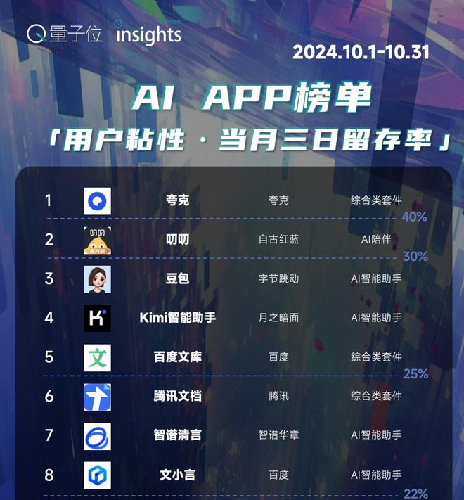 第一阶段AI应用的用户拉新基本结束,一众年轻人撑起了Kimi、豆包等热门AI应用的流量和月活。但AI应用间的用户交叉流动,数据显示,截至去年10月份,国内大部分AI应用月活跃率在22%以下。