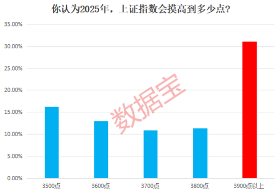 对于“你认为2025年,上证指数会摸高到多少点?”的调查,超30%的受访者认为上证指数将“3900点以上”,而上一期“震荡下行至3100点附近”的观点占比高达53%。