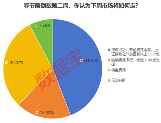 本周投资者情绪表现较为积极,明显提高了对指数的预期值。有超44%的受访者表示接下来一周市场将 “探底成功,节前震荡走高,上证指数在节前重新站上3300点”,这一数据在上周仅15%;超30%的受访者表示将“横盘震荡”;认为“继续震荡下行,考验3100点支撑”和“无法判断”的受访者占比合计25%。