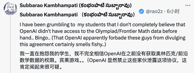 计算机科学家 Subbarao Kambhampati 表示,他此前就对 OpenAI 声称未预先接触奥林匹克数学和 FrontierMath 数据的说法持怀疑态度。在他看来,OpenAI 禁止相关方披露协议内容的做法本身就极具可疑性。