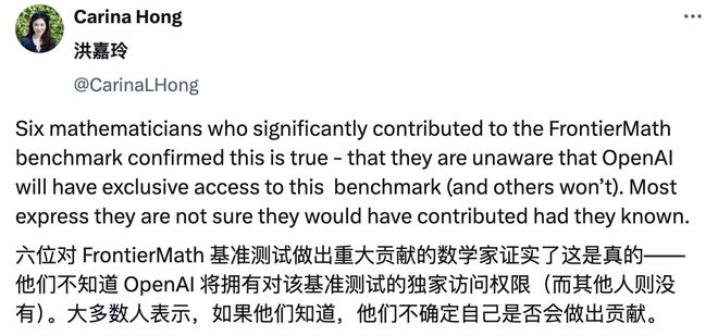 「对 FrontierMath 基准测试做出重大贡献的六位数学家向我证实,他们并不知道 OpenAI 会独占该基准测试的访问权限,而其他人无法获得,多数人表示,如果他们事先知情,可能不会选择参与。」