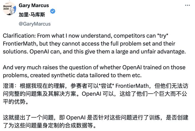 一个生动的打比方是,如果有人提前获得了试题和答案,而其他人只能靠实力应考,这样的比较显然缺乏公平性。OpenAI 不仅获得了问题和解决方案的访问权,而其他竞争对手如 xai、DeepMind 以及学术团队却无法获得相同资源。