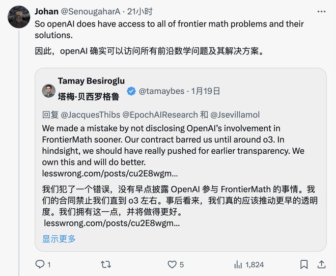 但这些解释并未能平息事件的争议,更多批评风浪涌向 Epoch AI 以及身处舆论漩涡的 OpenAI。