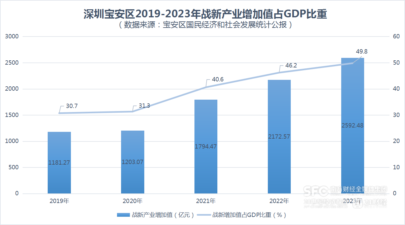 七年间,比宝安区持续扩大的工业总量规模更值得关注的是,该区战略性新兴产业增加值占GDP的比重从2019年刚过30%稳步提至2023年的49.8%,形成超高清视频显示、智能终端等“千亿”级产业集群,产业结构不断优化。