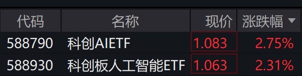 受盘面影响,科创AIETF、科创板人工智能ETF涨逾2%,盘中创上市新高。