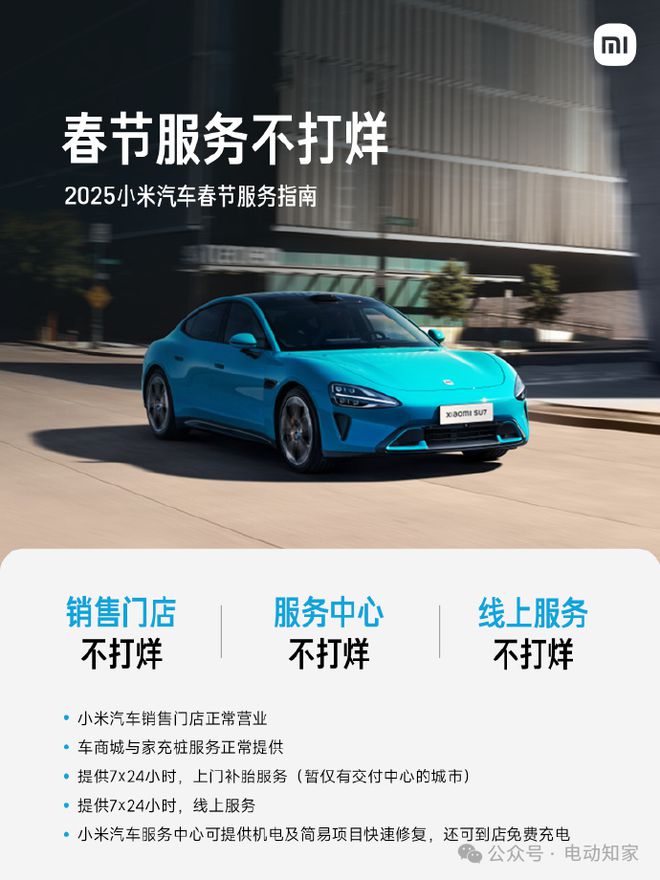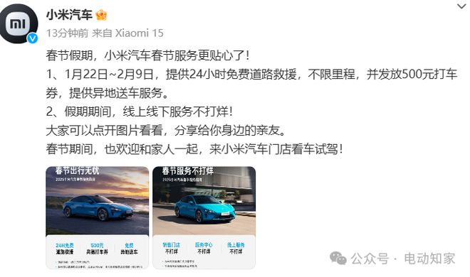 电动知家消息,1月21日,小米汽车官方发布消息,春节假期,小米汽车春节服务更贴心了!