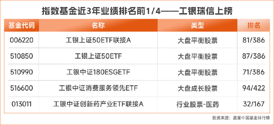2024年,被动投资浪潮来得尤为迅猛,被动型基金成为投资者捕捉市场beta和资产配置的利器。工银瑞信基金通过打造完善的指数产品家族谱系,旗下产品覆盖了宽基、行业主题、港股、多元配置、指数增强五大家族,提供丰富、多元、全覆盖的产品选择,以满足各类投资者从境内到境外,从稳健到进取的各类投资需求,助力投资者“一站式”完成ETF投资。在这场被动投资大发展中,工银瑞信基金旗下有多只被动型基金中长期业绩位居同类前列,其中既有A100、沪深300等主流宽基产品,亦有港股科技、半导体、央企等热门行业主题产品,凸显其布局优势。