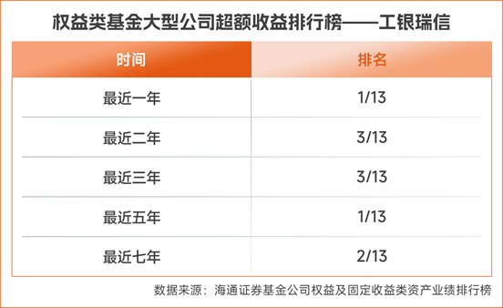 2024年,A股市场风云变幻,板块轮动频繁,主动权益投资成为基金公司投研实力的“试金石”。工银瑞信基金凭借其深厚的投资功底和敏锐的市场洞察力,不仅在权益投资领域持续深耕,更以一系列亮眼的成绩,展现了其整体领先之势。海通证券数据显示,截至2024年末,工银瑞信旗下主动权益基金近五年、近七年绝对收益率分别在权益类大型公司中排名第1和第2;其超额收益率近一年、近五年均在权益类大型公司中排名第1,近七年排名第2,近二年、近三年均排名第3,表现显著。