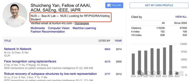 △图源:谷歌Scholar,下同林敏,NIN一作,目前是Sea AI Lab首席科学家,他从北大元培班毕业,最开始进入NUS还在专注生物科学专业,随后转向计算机来到颜水成团队,结果意外提出NIN网络架构一举成名。