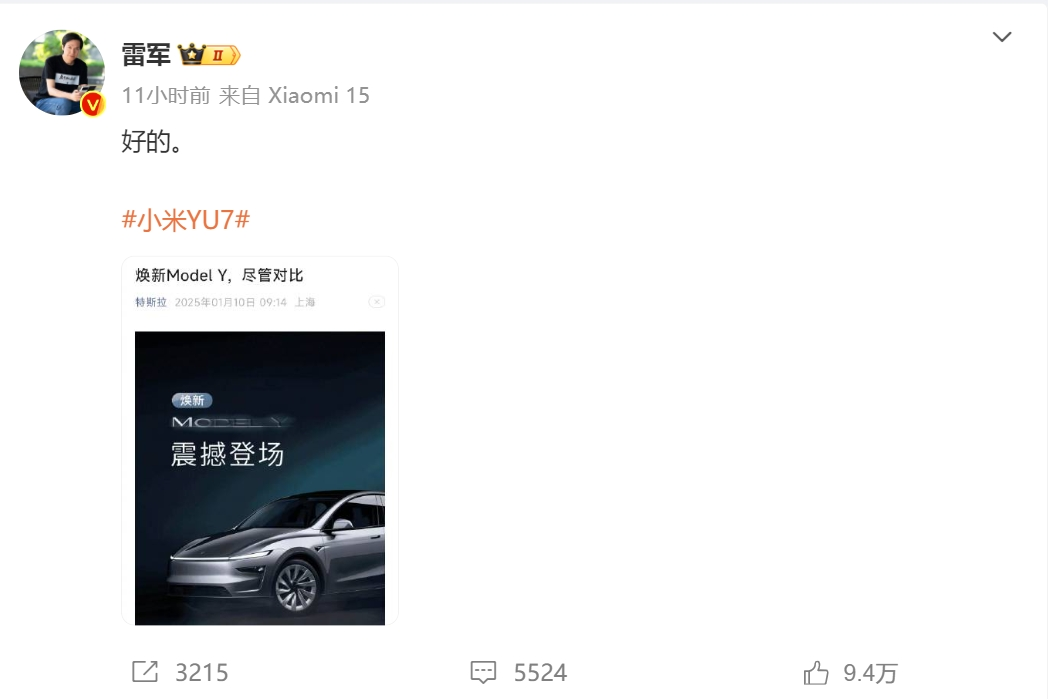 1月21日,小米创办人,董事长兼CEO雷军在微博上发文表示:“上个月交付量超过了 Model 3。”