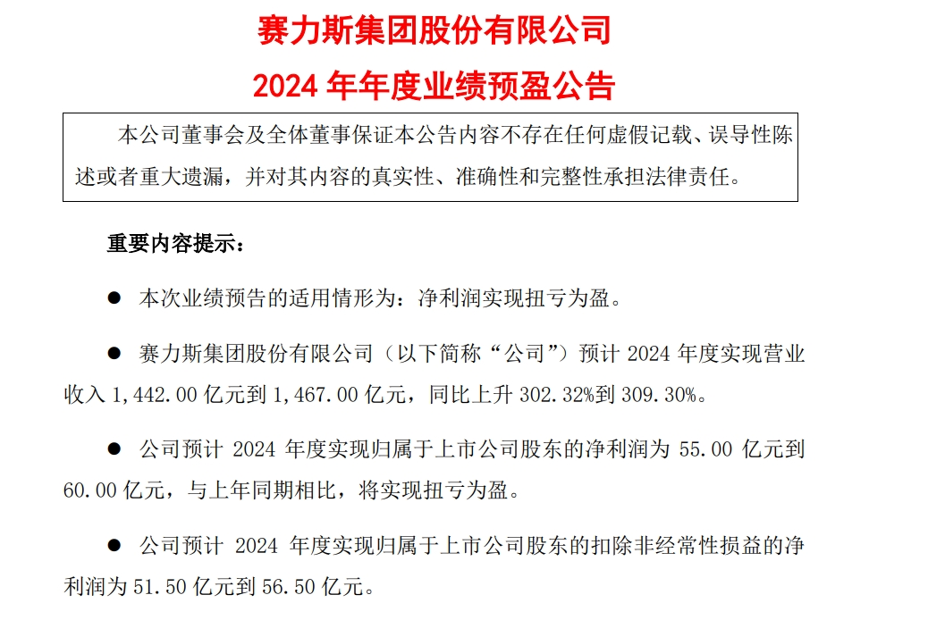 1月21日晚,赛力斯(601127.SH,股价138.91元,市值2097.2亿元)公告,预计2024年度实现营业收入1442亿元到1467亿元,同比上升302.32%到309.30%。预计实现归属于上市公司股东的净利润55亿元到60亿元,同比扭亏为盈。