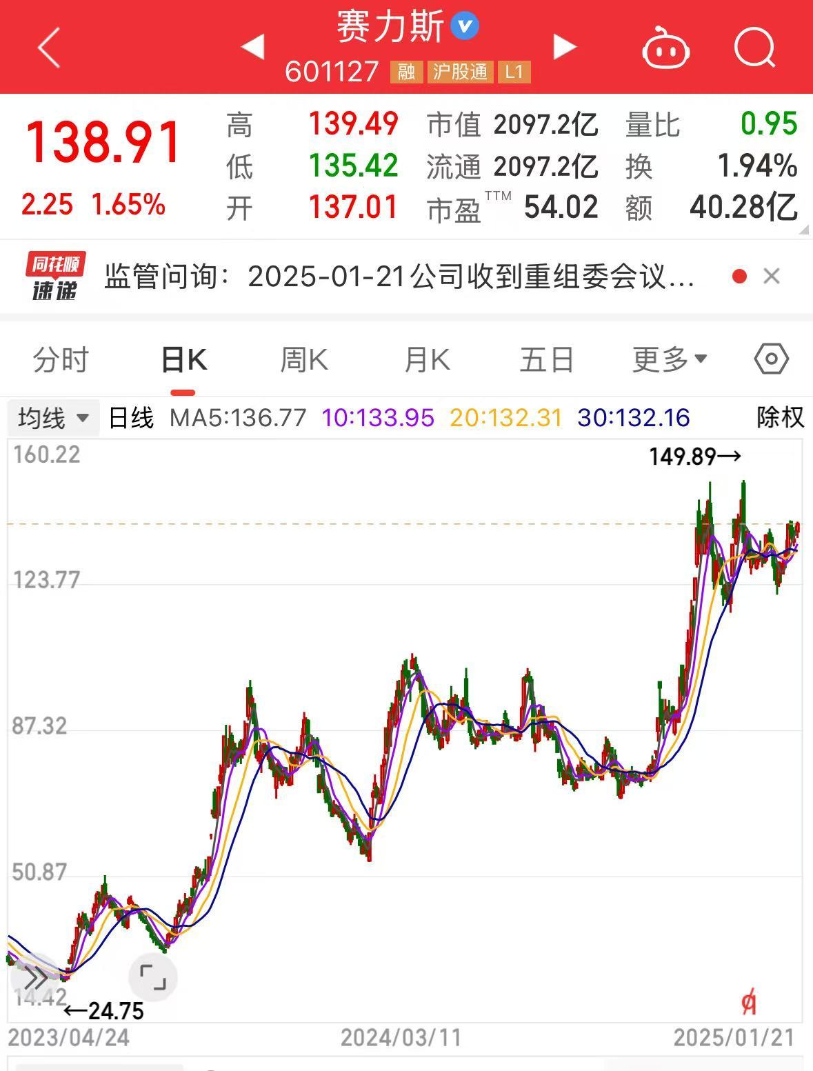 值得注意的是,赛力斯2024年股价大涨,从年初的76.2元一路涨至133.39元,涨幅达75.05%。截至1月21日A股收盘,公司股价上涨1.65%。