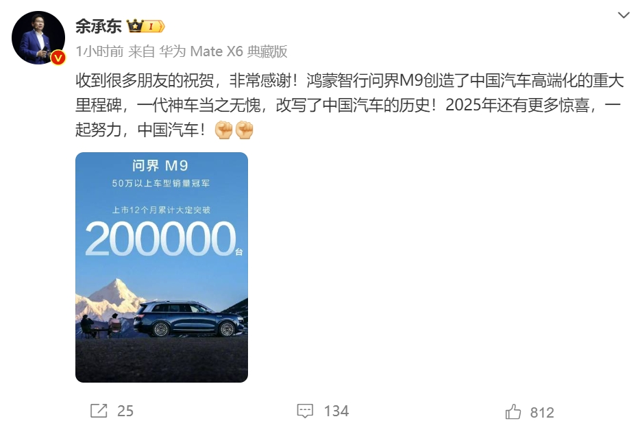 2024年12月27日,华为常务董事、终端BG董事长、智能汽车解决方案BU董事长在微博发文表示:“收到很多朋友的祝贺,非常感谢!鸿蒙智行问界M9创造了中国汽车高端化的重大里程碑,一代神车当之无愧,改写了中国汽车的历史!2025年还有更多惊喜,一起努力,中国汽车!”