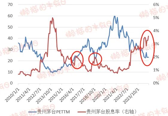 比如茅台,2014年时股息率曾高达5%,但那时因为塑化剂和打压三公消费,茅台备受质疑,PE降至10倍左右。