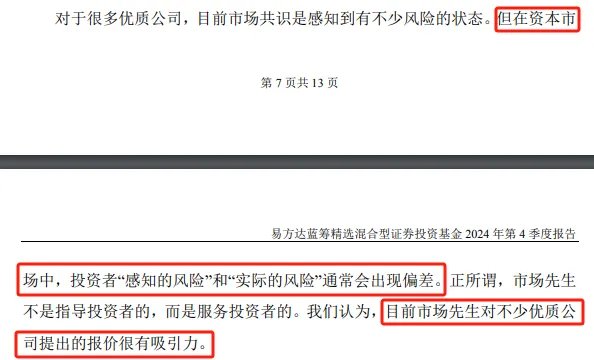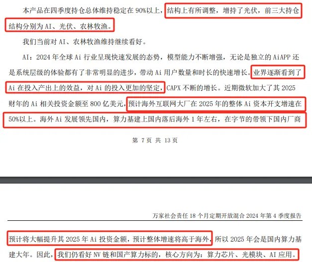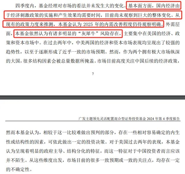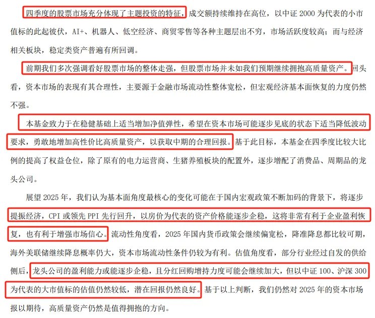 4)因此,他看好2025年的行情,适度降低了波动性要求,勇敢的增加高性价比的高质量资产,在四季度大幅提高了权益仓位,增配了消费品、周期品龙头公司。