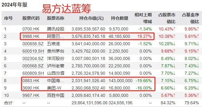 张坤调整不大,“易方达蓝筹”小幅减持中海油、美团,加仓阿里巴巴。
