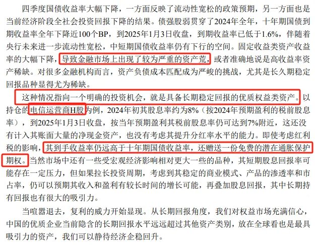 2)这种情况下,具备长期稳定回报的优质权益类资产是一个比较明确的投资机会,比如某H股电信运营商,2024年初股息率约8%,2025年初也有7%,即使考虑到红利税,这个收益率对机构也很有吸引力。