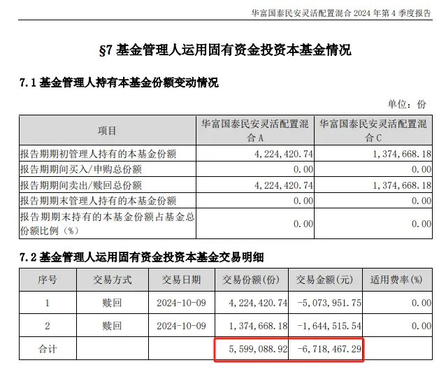 2024年10月9日,华富基金高位精准赎回了559.9万份“华富国泰民安”,一键清仓。