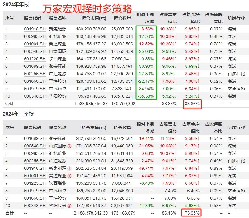 重仓股持股数量相对上期减少,主要是基金被赎回较多。A+C合并计算,“万家宏观择时多策略”的基金份额从11亿份降至7.8亿份,被净赎回29%。