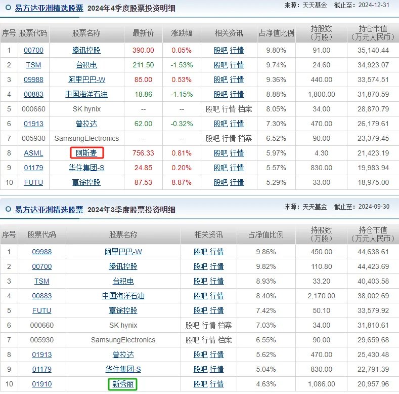 易方达亚洲精选,把新秀丽踢出十大重仓股,取而代之的是阿斯麦。同时,腾讯、阿里的持股数量均较三季度有所下降,可能是因为基金被净赎回。四季度,“易方达亚洲精选”的基金份额从41.9亿份降至35.57亿份,被净赎回了15%。
