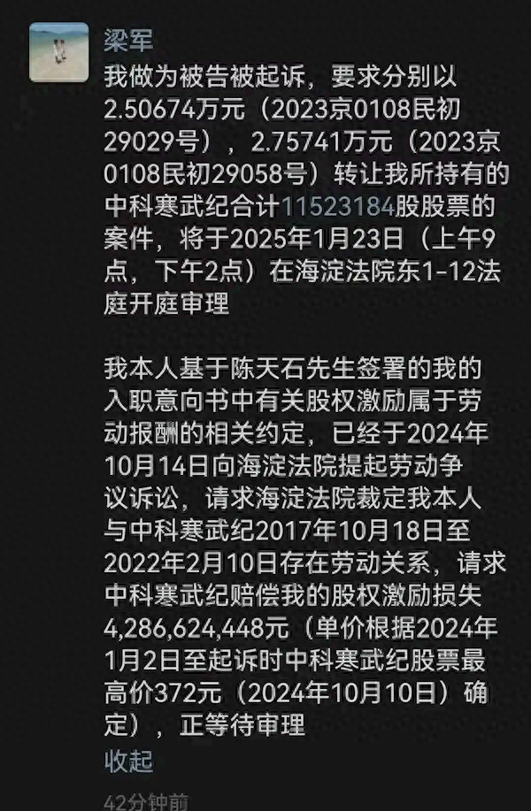 “我本人基于陈天石先生(寒武纪创始人、CEO)签署的我的入职意向书中有关股权激励属于劳动报酬的相关约定,已经于2024年10月14日向海淀法院提起劳动争议诉讼,请求海淀法院裁定我本人与中科寒武纪2017年10月18日至2022年2月10日存在劳动关系,请求中科寒武纪赔偿我的股权激励损失4,286,624,448元(单价根据2024年1月2日至起诉时中科寒武纪股票最高价372元(2024年10月10日)确定),正等待审理。”梁军在朋友圈称。