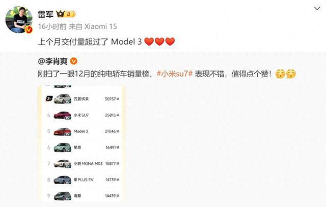 【环球网科技综合报道】1月22日消息,小米集团创办人、董事长兼CEO雷军于日前转发小米汽车副总裁李肖爽的微博称,小米 SU7 上月交付量超过特斯拉 Model 3。
