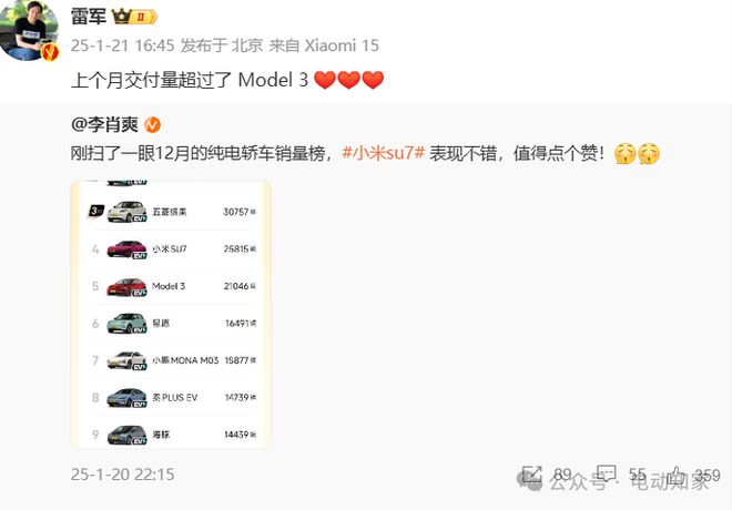 电动知家消息,1月21日,小米集团董事长兼 CEO 雷军转发小米汽车副总裁李肖爽的微博,并称小米 SU7 上个月(2024 年 12 月)交付量超过特斯拉 Model 3。