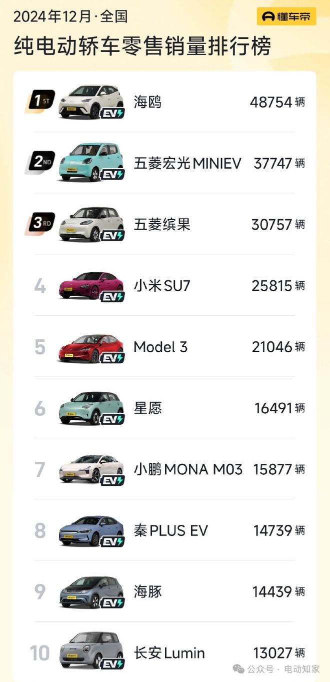 李肖爽贴出的纯电轿车销量榜显示,2024 年 12 月,小米 SU7 销量为 25815 辆,排名第五;特斯拉 Model 3 销量为 21046 辆,排名第六。排在前三的分别为比亚迪海鸥、五菱宏光 MINIEV、五菱缤果。