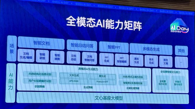 现场,百度文库AI产品负责人钟昊提出从传统模型到大模型,AI专用能力逐渐通用化。因此,新一代AI工具主要解决端到端交付、纯自然交互、全模态支持3大内容生产创作瓶颈。