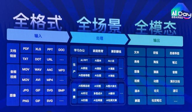 因此,百度文库和百度网盘此次联手搭建了“自由画布”,一个全新的内容操作平台,主打“忘掉模态、文件格式的限制,随心AI创作”。具体来看,其支持文档链接、音视频等“全格式输入”,AI研报、AI画本、AI识图等“全场景处理”,以及思维导图、漫画、演示文档等“全模态输出”。