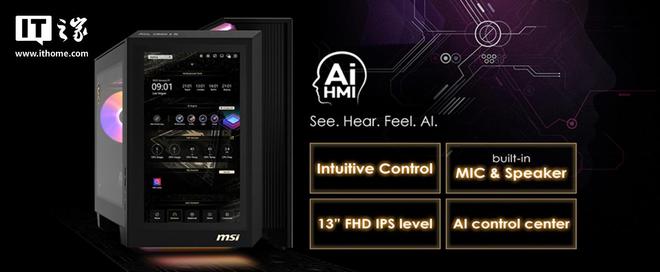该机整机前面板配备了一块13英寸 1080×1920分辨率IPS触控屏,可用于操控其内置的微星独家AI应用程序,同时内置语音交互功能。