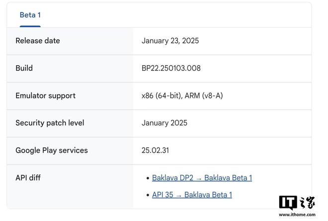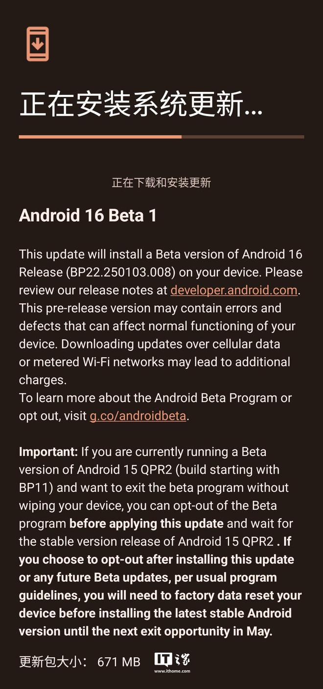 IT之家 1 月 24 日消息,Android 16 Beta 1 现已今日正式发布,版本号为 BP22.250103.008,比 Android 15 QPR2 Beta 3 更新。谷歌 Pixel 6 及更新机型现可检查 OTA 更新。